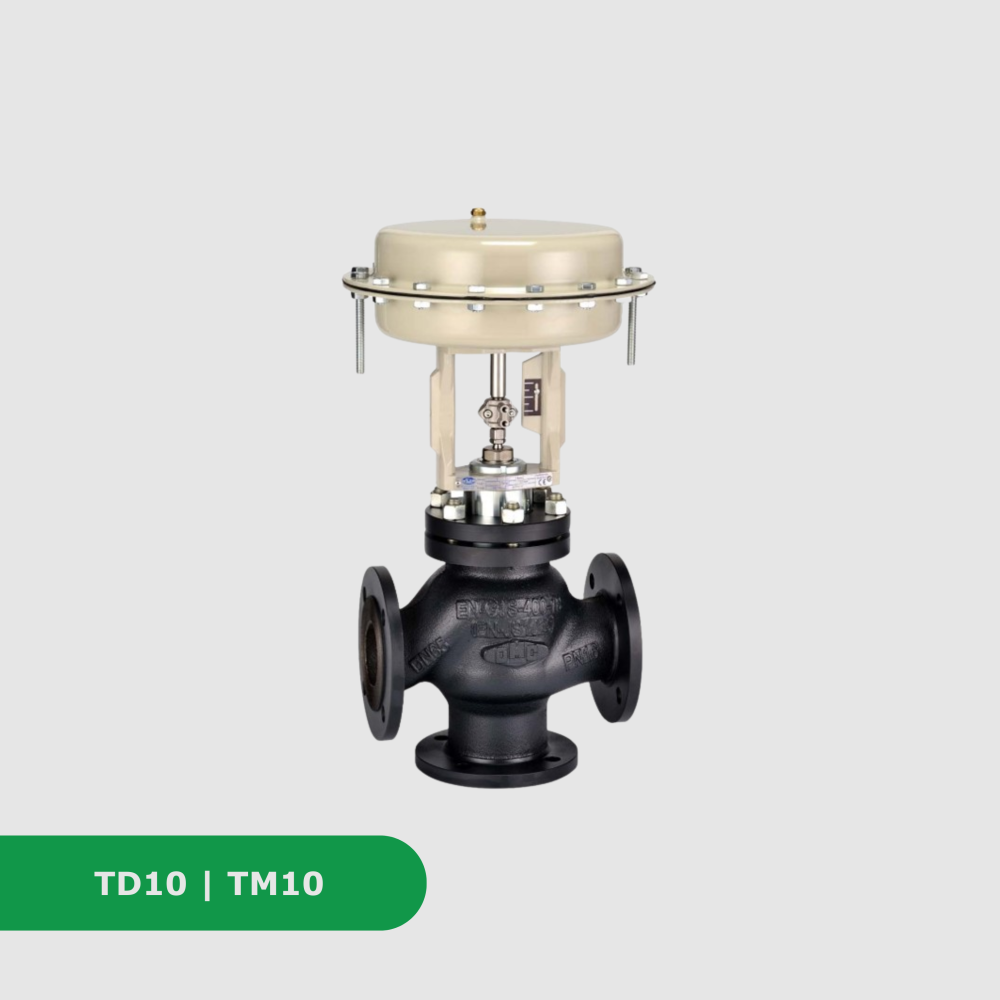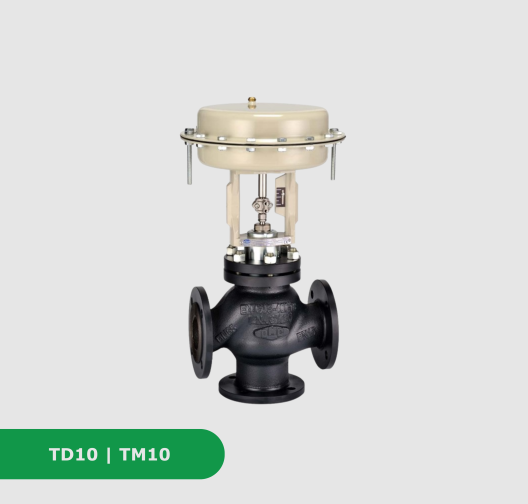 A Válvula de Controle Série TD10 (Divergente) e TM10 (Misturadora) é uma válvula de 3 vias que desvia o fluxo em sistemas de controle de processos. Disponível em ferro fundido, aço carbono e inoxidável, pode ser equipada com atuadores pneumáticos ou elétricos.